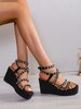 Beige hoge sandaal met sleehak versierd met strass steentjes