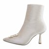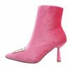 Bottines roses suèdes avec boucles frontales en strass, talons hauts et fins.