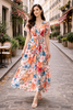 Elegante maxi jurk met turquoise bloemenprint en strikceintuur