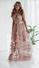 Elegante zwarte galajurk in tulle zonder mouwen en met volants.