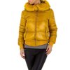 Korte rode gewatteerde winterjas met capuchon en pels.