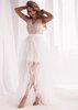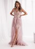 Stijlvolle zwarte mouwloze maxi jurk in kant met onderstuk in tulle met volants.