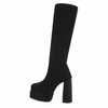 Zwarte hoge sock laars met hoge stevige blokhak.